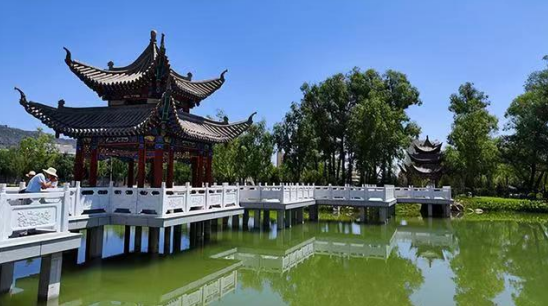 为景点命名。综合考察广河历史文化遗存,细致视察公园营造之特色,遂将其命名为大夏公园,并结合园内景点布局、建筑特色、用途等,为亭、榭、湖、轩、桥等景点命名,如齐家亭、半山亭、天保廊、钟鼎山房等。最让人心旷神怡处,当为波光粼粼的湖面,因形状颇似如意,故命名为如意湖,而分东西横卧在湖面最狭窄处的两座握桥,分别命名金龙桥、玉凤桥。