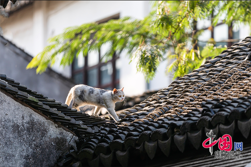 在毛孩子眼里,这就是包容一切活动的「游乐场」,片片青瓦上留下梅花印。或许你也该往古镇的屋顶上瞧,檐角翘伸、清风古韵,让人心旷神迷。或同那只猫一样攀上高处,推窗看那水那桥,那木门青瓦,就是江南水乡的具象。