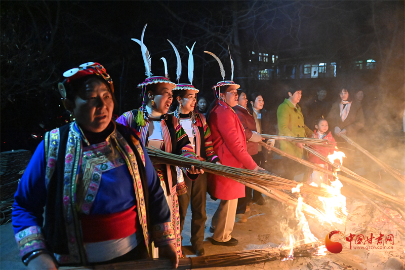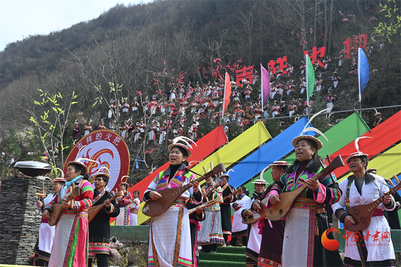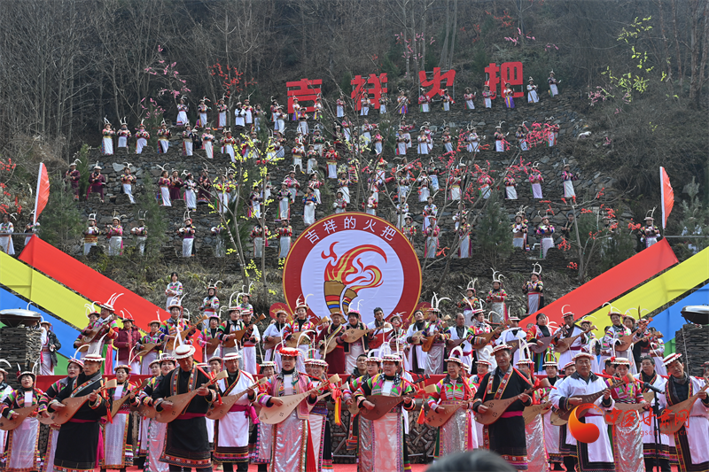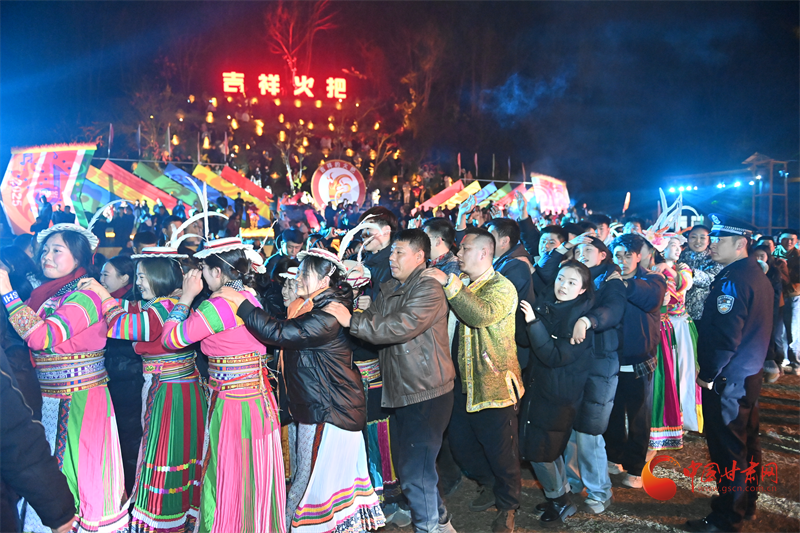 夜幕降临,元宵夜的欢乐氛围达到顶峰,大山深处星光点点的火把,汇聚成一条火龙沿山而下,将吉祥的火种带到火把节,开启白马山寨的夜晚联欢。